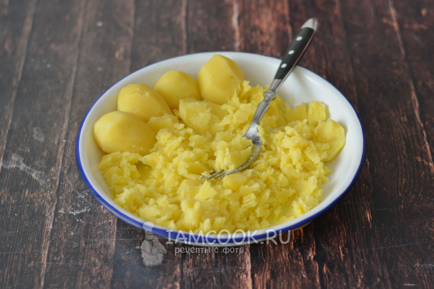 Картошку в горячем виде разомните вилкой или толкушкой. Степень измельчённости картофеля может быть любой - от слегка раздавленного картофеля до однородного пюре.