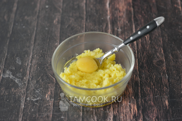 От общего объема картофеля отмерьте примерно 150 г, отложите его в отдельную миску. Вбейте к размятому картофелю яйцо, добавьте щепотку соли и размешайте.