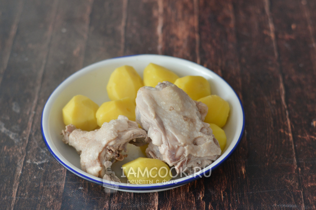 В кастрюлю положите куски курицы и залейте водой. Доведите до кипения, снимите всю пену и убавьте огонь. Варите куриный бульон при тихом кипении примерно 30 минут, посолите по вкусу. Через 30 минут положите в бульон очищенный картофель целиком, и варите его вместе с курицей до полной готовности. Время варки картофеля будет зависеть от сорта и размера клубней, у меня они варились 30 минут.