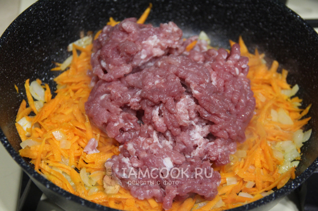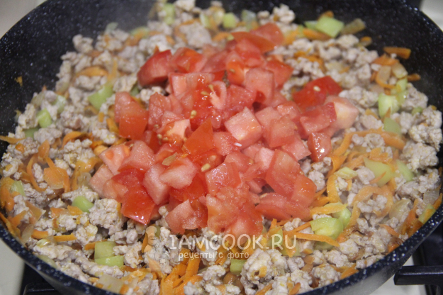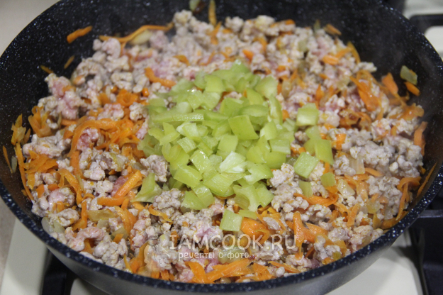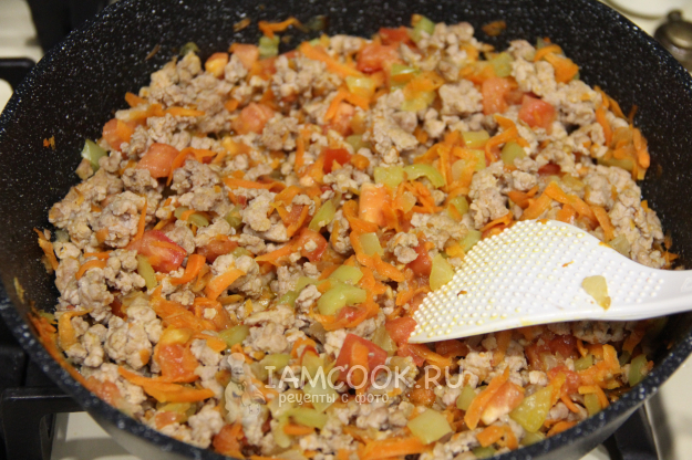 Обжарить овощи минут 5. Затем добавить фарш.