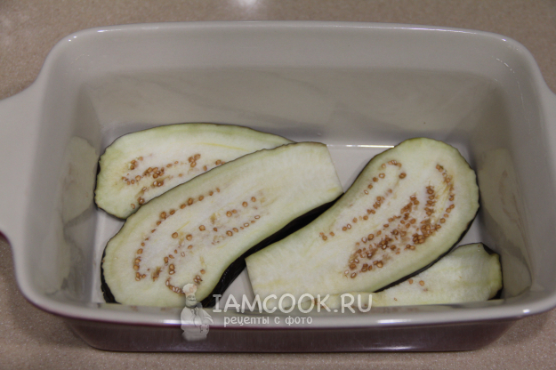 Баклажаны нарезать на полоски толщиной примерно 5мм. В жаропрочную форму выложить слой баклажановых полосок.