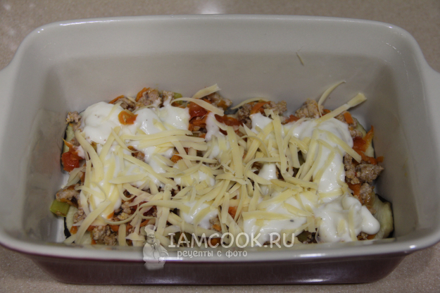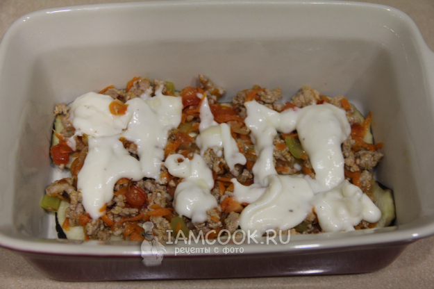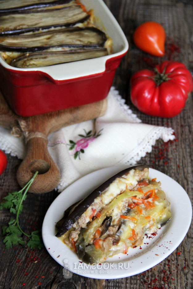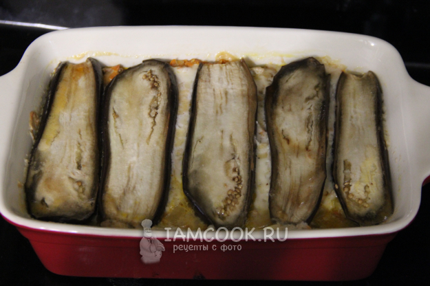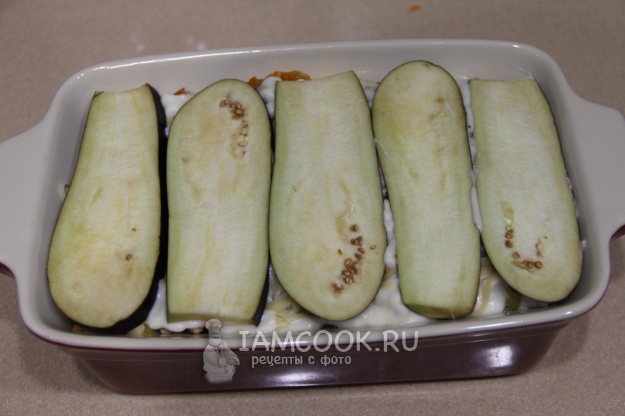 Сформировать лазанью, чередуя слои. Верх закрываем пластами баклажана.