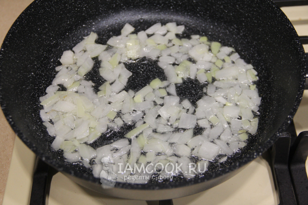 Лук мелко нарезать и обжарить на растительном масле до прозрачности.