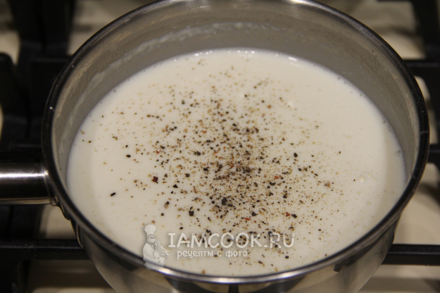 Влить всё молоко, довести соус до кипения. Добавить соль, сахар и перец. Перемешать. Соус получится однородным, в меру густым. Готовый соус снять с огня.