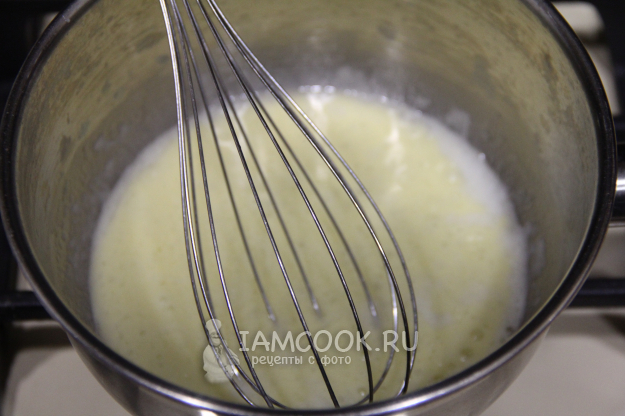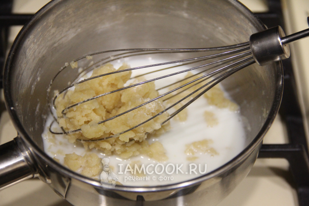 Быстро перемешать массу, заварить муку. Затем влить небольшими порциями молоко и тщательно перемешивать соус венчиком.