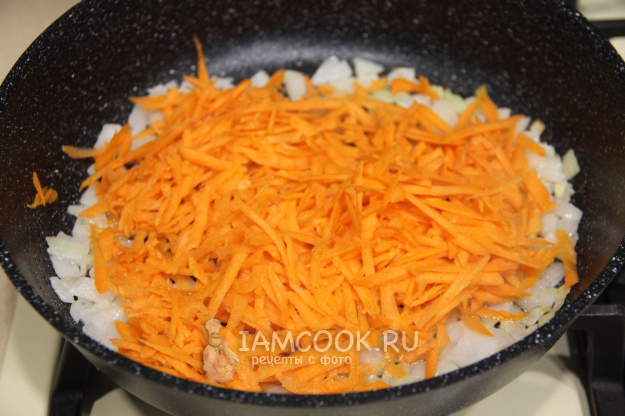 Морковь натереть на терке. Добавить морковь в сковороду к луку.