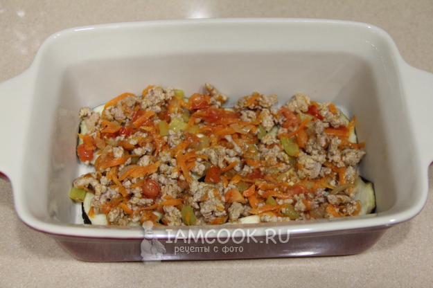 Затем выложить слой начинки из фарша и овощей.