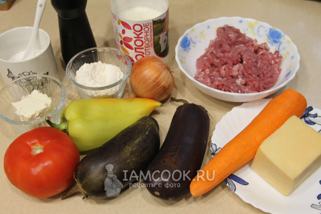 Соберите продукты для приготовления лазаньи из баклажанов с фаршем в духовке. Лук и морковь почистить. Овощи помыть. Я использовала некрупные баклажаны.