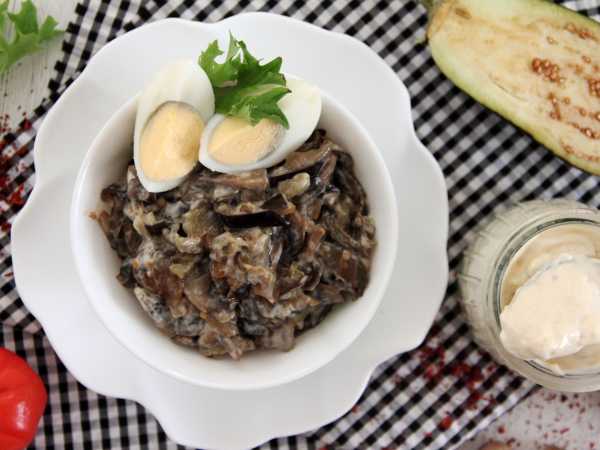 Подать салат из баклажанов и грибов с майонезом к столу.