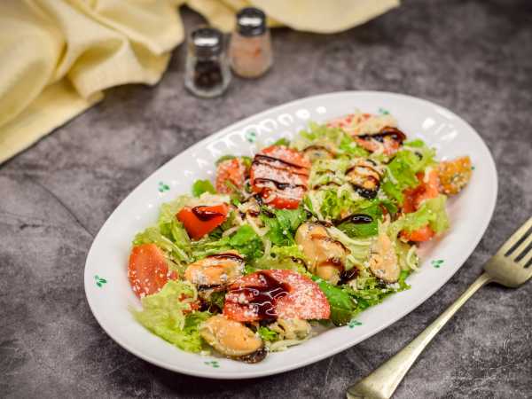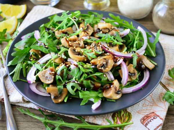 На тарелку выложите "подушку" из рукколы и полейте половиной приготовленной заправки.
