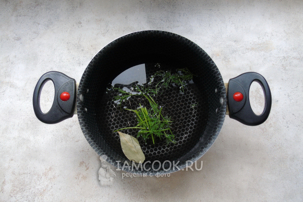 В кастрюлю налейте воду, выложите укроп и лавровый лист. Немного посолите.