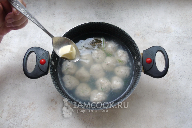 Из фарша сформируйте клецки размером чуть больше грецкого ореха. Доведите воду в кастрюле до кипения и выложите клецки. Добавьте сливочное масло.