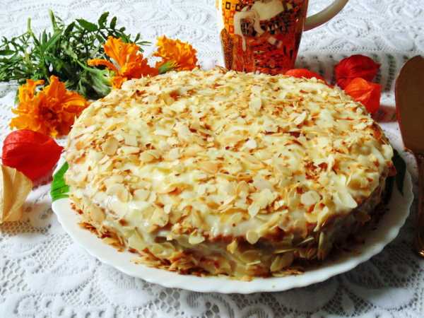 Для приготовления такого торта нужно взять: яйца, сахар, ванильный сахар, муку, соду, молоко, хлопья миндаля.