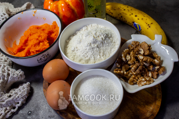 Соберите необходимые продукты для приготовления тыквенно-бананового кекса. Тыквенное пюре я приготовила накануне, но если у вас его нет, то можно приготовить удобным для вас способом. Тыкву можно запечь в духовке, микроволновке или отварить, предварительно ее почистив. А затем измельчить в однородное и гладкое пюре. Банан для кекса возьмите очень спелый. Касательно количества сахара, если вам нравится сладкая выпечка, то добавьте его немного больше. Я не очень люблю приторную выпечку, мне нравится чувствовать вкус каждого продукта, а не только сахар. Поэтому, возможно, для сладкоежек, сахара, указанного в ингредиентах, будет маловато.