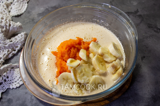 Добавьте тыквенное пюре и нарезанный на небольшие кусочки банан. Банан также можно размять в пюре. Соедините ингредиенты миксером на невысоких оборотах.