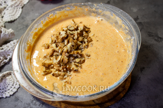 Грецкие орехи порубите на небольшие кусочки и добавьте в тесто. Перемешайте.