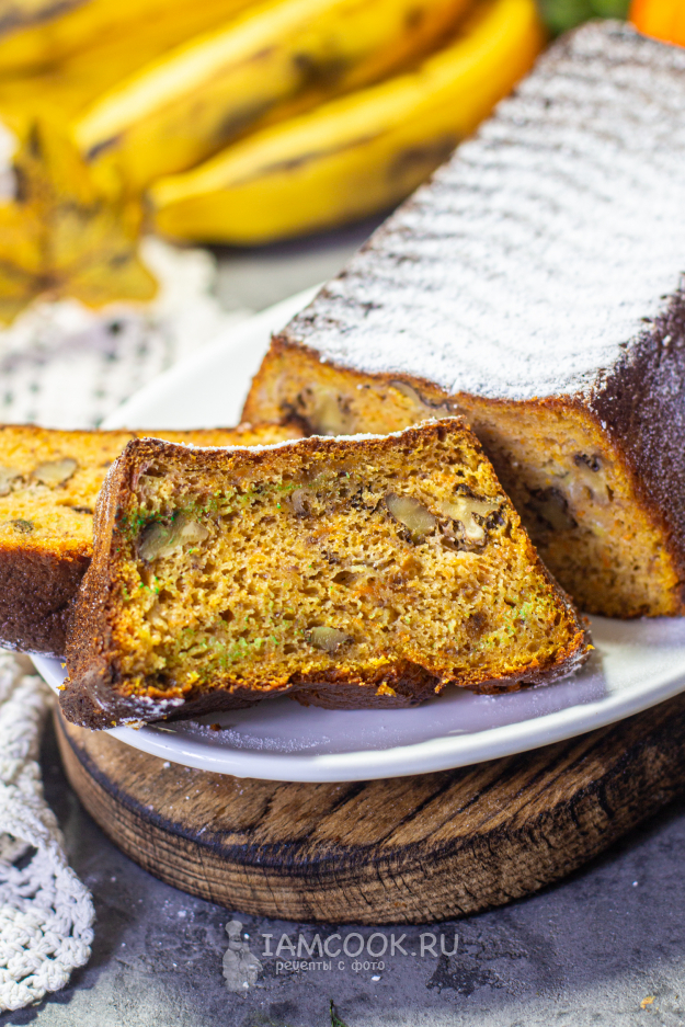 Достаньте испеченный кекс. Готовность проверьте деревянной шпажкой - она должна выйти из середины тыквенно-бананового кекса абсолютно сухой. Дайте ему постоять в форме минут 10, а затем переверните на блюдо и снимите аккуратно форму. Если пользуетесь не силиконовой формой, то ее необходимо смазать маслом или выстелить пергаментом. Кекс остудите и по желанию, присыпьте сахарной пудрой.