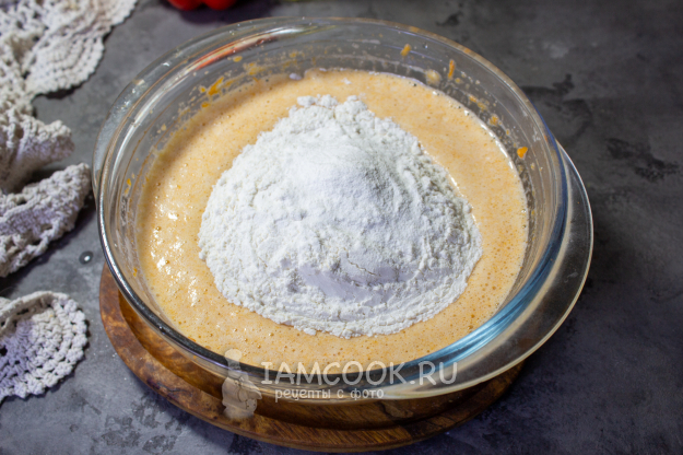 Всыпьте просеянную рисовую муку и разрыхлитель.