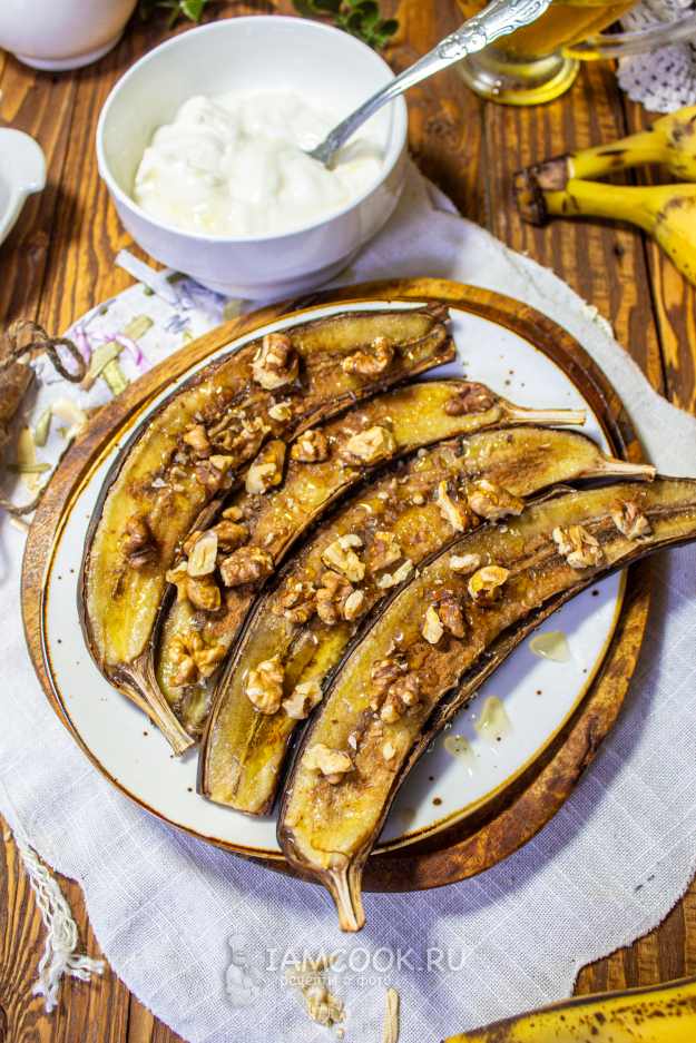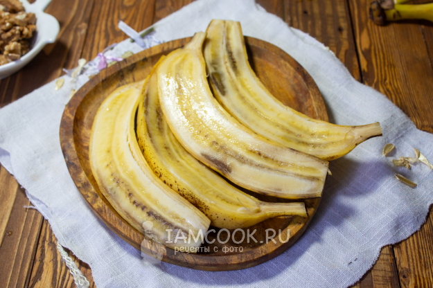 Переложите бананы на тарелку, посыпьте орехами, полейте медом и подавайте.