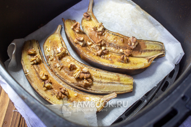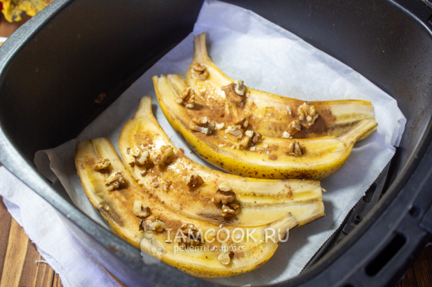 И добавьте сверху небольшое количество рубленых грецких орехов. Установите время приготовления - 10 минут. Температура выпечки - 180 градусов. Готовьте бананы в аэрогриле до сигнала.