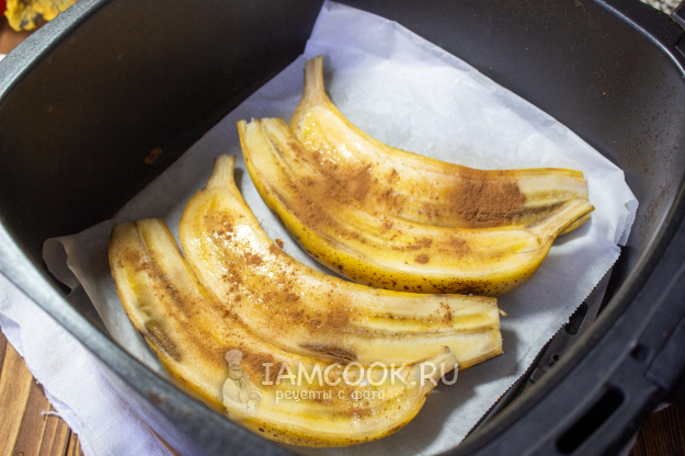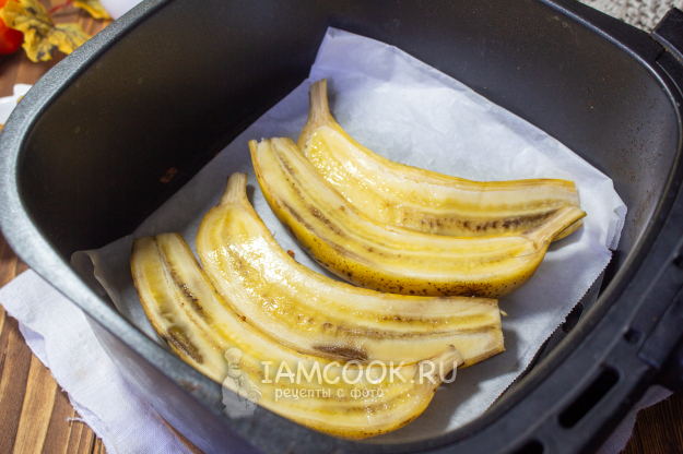 Бананы установите срезом вверх в чашу аэрогриля. Я застелила пергаментом, но это не обязательно.