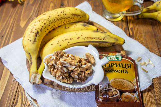 Соберите необходимые продукты для приготовления бананов в аэрогриле с орехами. Нам понадобятся спелые бананы, грецкие орехи и корица. И для подачи - греческий йогурт и мед.