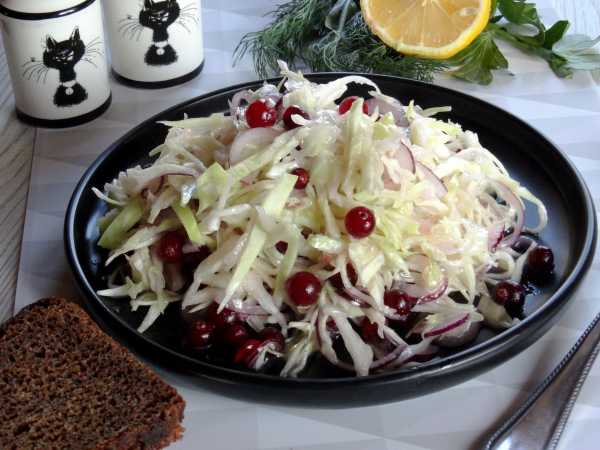 Казалось бы, обычный салат с капустой и луком, что тут нового? Изюминка в виде клюквы перевернет ваше представление об этом салате. Кислая ягода с горчинкой "взрывается" при поедании, и привычный вкус салата меняется до неузнаваемости. В витаминный салат можно ещё добавить сочную морковь.