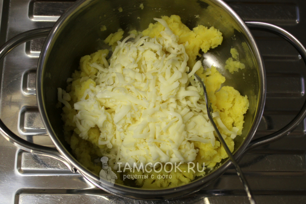 Готовый горячий картофель разомните и прямо в горячеватый вмешайте сыр. Если сыр солёный, то дополнительно начинку не солите. Разделите тесто и начинку на две части.