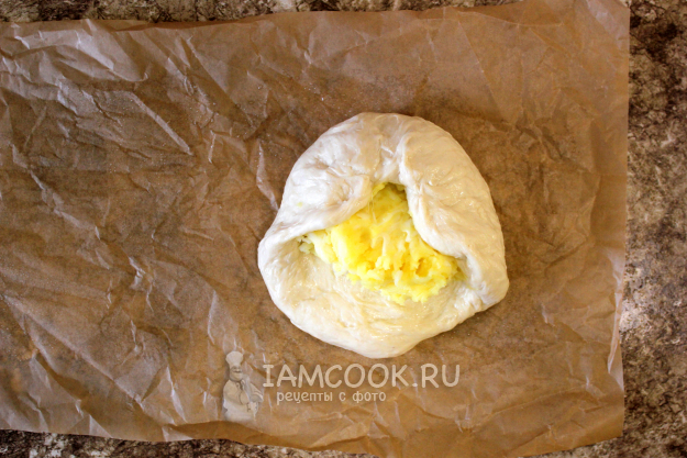 Сформируйте пироги. Для этого каждую порцию теста приплюсните в лепешку такого диаметра, чтобы потом обернуть им начинку.