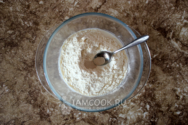 Для теста соедините все ингредиенты для теста: молоко комнатной температуры, расплавленное сливочное масло, муку, соль, сахар и сухие дрожжи.