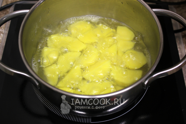 Для начинки сварите картофель. Время варки зависит и от сорта картофеля, и от размеров кусков. По-моему, пюре получается вкуснее из крупных, почти целых картофелин, но быстрее-то из тонких…