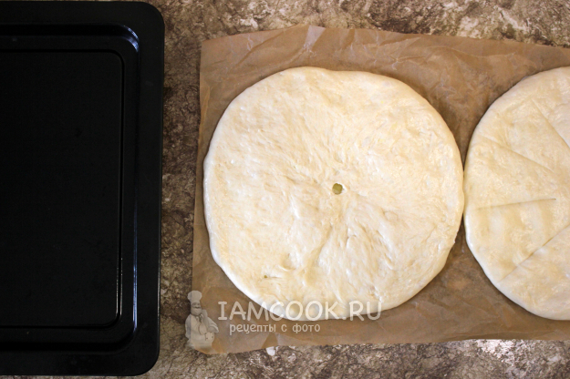 Может быть, когда-нибудь попробую сделать осетинский пирог большого диаметра, но это не точно… Вряд ли мне хватит на это мастерства! А в настоящий момент у меня маленькая духовка, в которую и помещается маленький противень размером как половина стандартного. Так что пекла одновременно два небольших, а в принципе, таких же по размеру, как в кулинариях и пекарнях.
