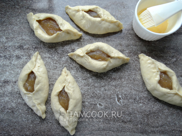 Выпекать расстегаи с повидлом при температуре 180-190 градусов до румяного состояния, у меня ушло 20 минут.