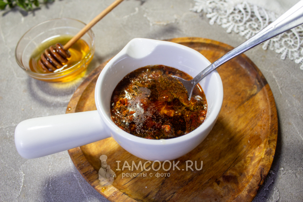 Пока крылышки в духовке, приготовьте соус, которым будем их смазывать. Соедините все ингредиенты по списку для соуса. Острый молотый чили можете отрегулировать на ваш вкус. Если желаете более острые, то добавьте немного больше, и наоборот. Я приготовила умеренно острые.