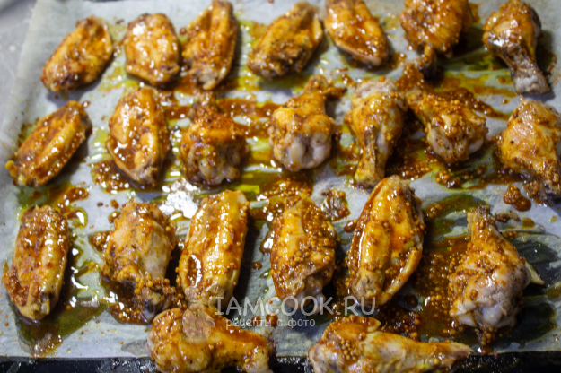 По истечении времени достаньте слегка подпеченные крылышки из духовки и смажьте при помощи кисточки приготовленным соусом. Смажьте только с одной стороны. Поставьте обратно в духовку и пеките еще минут 10 при той же температуре.