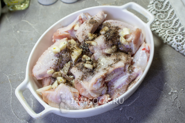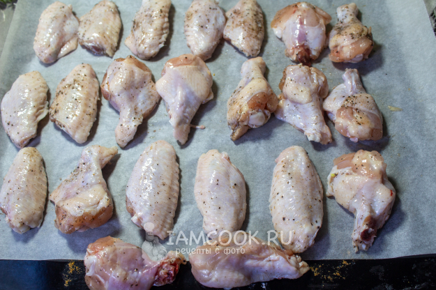 Крылья помойте и обсушите. У меня куриные крылышки из двух фаланг (без самой маленькой). Разделите крылышки на части, разрезая их по суставу. Сложите в подходящую посуду, добавьте соль, черный молотый перец и нарезанный чеснок. Влейте ложку масла и тщательно перемешайте крылья со специями.