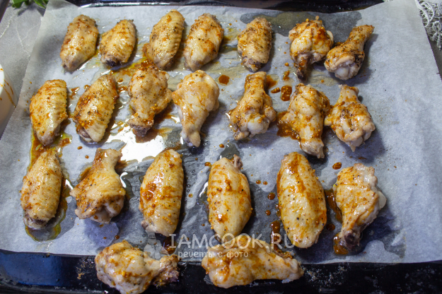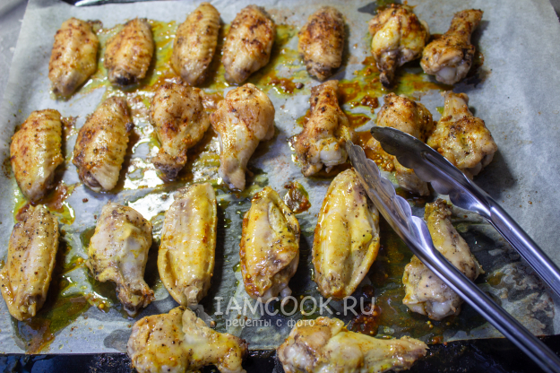 Через 10 минут достаньте куриные крылья и переверните их на другую сторону.