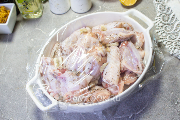 Накройте форму пищевой пленкой и оставьте мариноваться примерно на 2 часа при комнатной температуре. Если собираетесь мариновать дольше, то уберите их в холодильник.