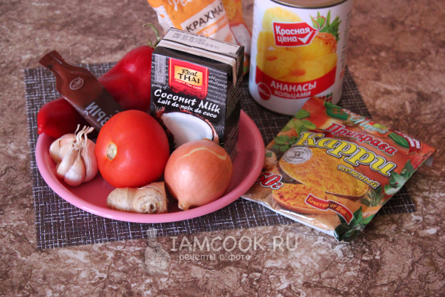 Для соуса карри с ананасом подготовьте ингредиенты по списку к рецепту. Ананасы подходят свежие, замороженные или консервированные. Если избегаете остроты перца чили, то берите вместо него сладкий красный.