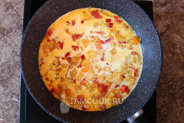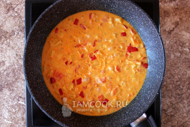 Тушите всё вместе 5-7 минут, затем влейте кокосовое молоко и соевый соус с растворенным в нём кукурузным крахмалом. Доведите до закипания, убавьте огонь до самого слабого и тушите 3-5 минут или до признаков загустения.