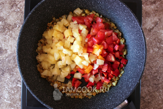 Минуты через три-четыре добавьте ананасы, помидоры и перец. Помидоры нужно нарезать средним кубиком, рекомендуется предварительно снять с них кожуру. Перец нужно нарезать мелким кубиком, сначала убрав из него семена. Ананас порежьте кубиком или брусочками.