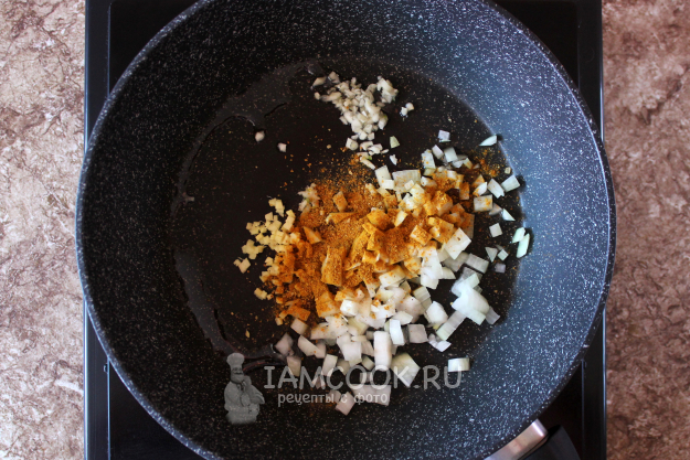 На растительном масле (кокосовом или просто подсолнечном для жарки) потомите на среднем огне тонко нашинкованный лук, тёртый имбирь и крупно рубленный чеснок. Слегка посолите и посыпьте смесью специй карри. Помешивайте.