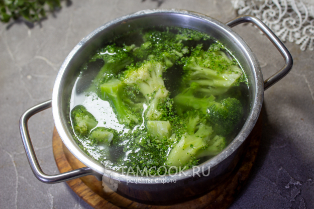 Брокколи разберите на соцветия, опустите в кипящую воду и варите 3-5 минут. Я готовила из замороженной капусты и варила ее не размораживая. Затем достаньте капусту и откиньте на сито, чтобы стекла лишняя влага.