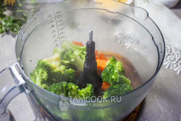Лук и морковь очистите и нарежьте кусочками, отправьте в блендер. Добавьте капусту.