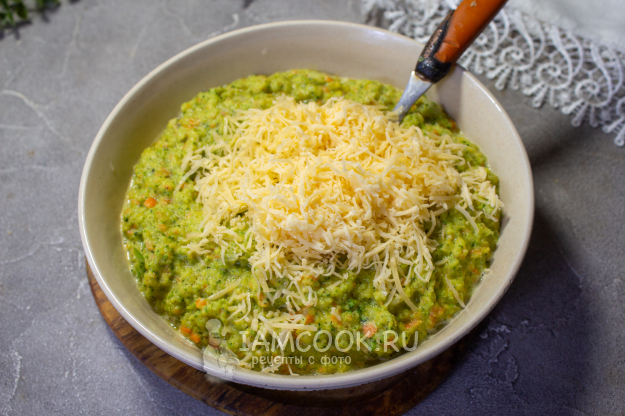 Переложите в подходящую посуду и добавьте натертый сыр.