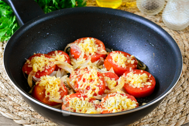 На горячие помидоры выложите натертый твердый сыр, прикройте сковороду крышкой и готовьте блюдо на медленном огне еще примерно 1 минуту, чтобы сыр расплавился.