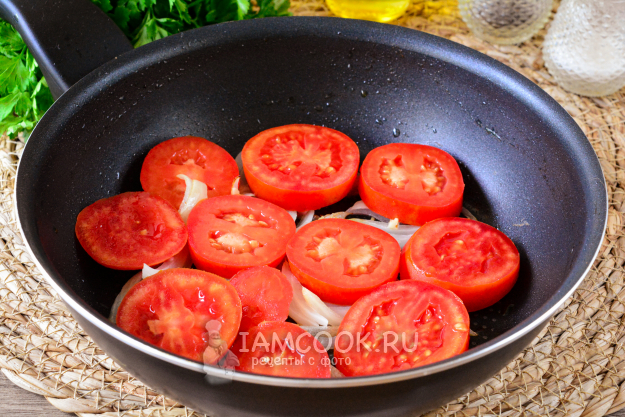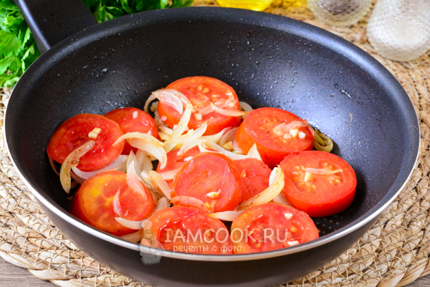 Добавьте в сковороду помидоры, выложите их ровным слоем.