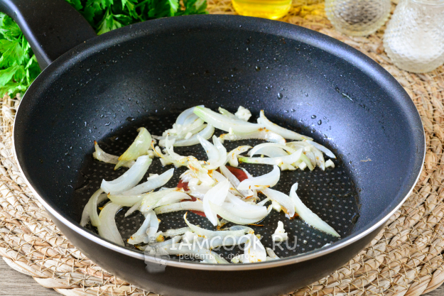 Сковороду смажьте растительным маслом, разогрейте на среднем огне, выложите лук и чеснок, жарьте овощи пару минут, до появления приятного аромата.