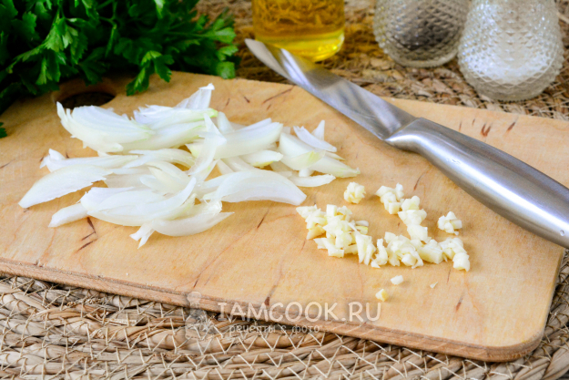 Почистите репчатый лук и зубчики чеснока. Лук нарежьте полукольцами, а чеснок - небольшими кусочками.