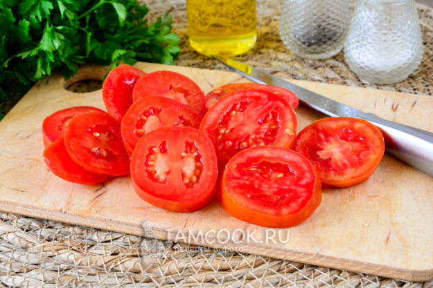 Соберите необходимые продукты для приготовления жареных помидоров с сыром на сковороде.